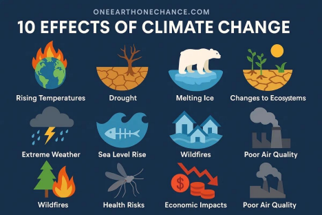 Some of the effects of climate change include extreme droughts, water shortages, serious fires, rising sea levels, floods, melting polar ice, powerful storms, and loss of animal and plant life.