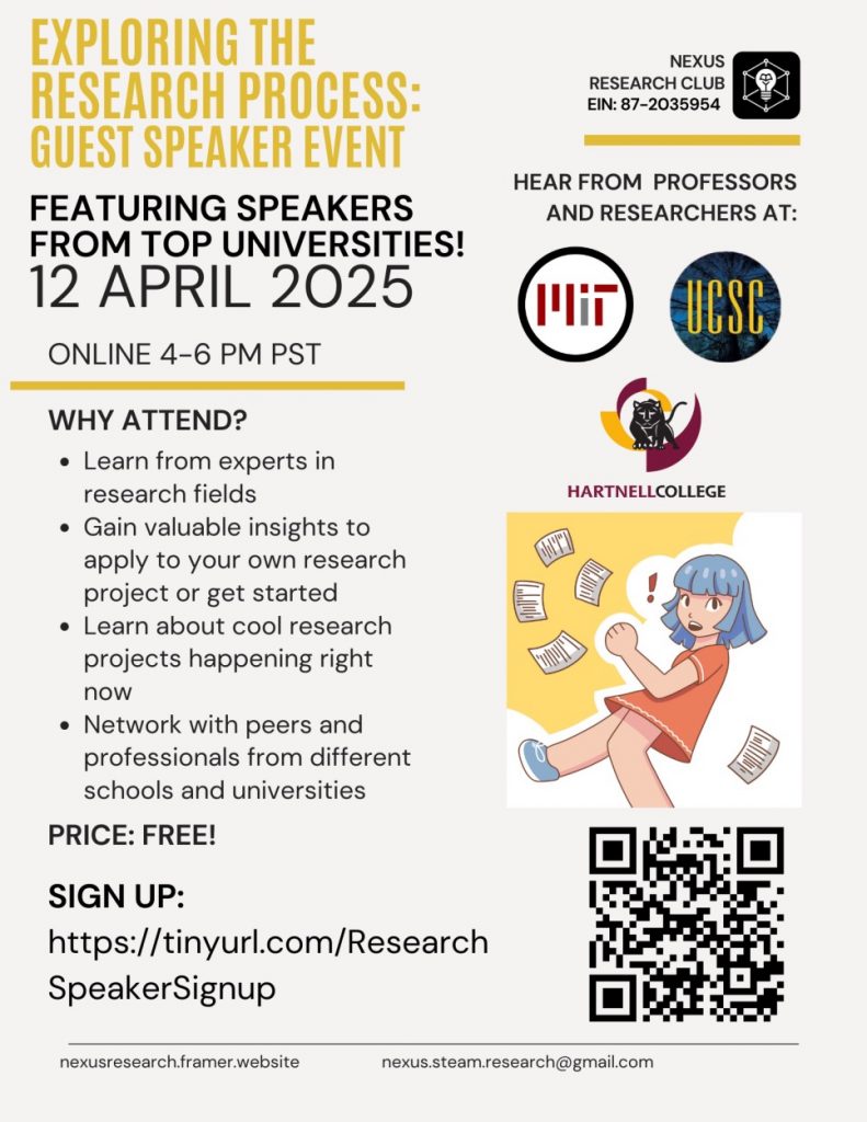 Hey @everyone ! We’re hosting a Research guest speaker event hosting professors from different universities to speak about their research experiences and how to get started as a high schooler! Sign up with the qr code or link!